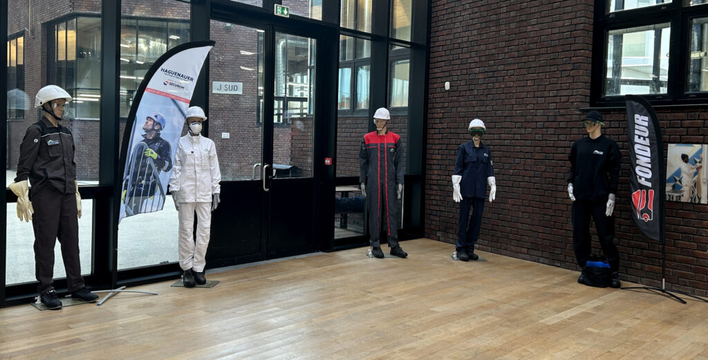 Cette dynamique se traduit aussi par une exposition installée dans l’atrium de l’Éco-Campus, réalisée en partenariat avec nos fournisseurs, qui présente les EPI fournis aux apprentis sur nos métiers.